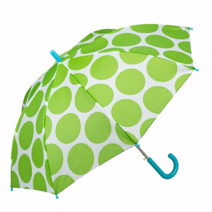 Paraguas de apertura automática con estampado de grandes círculos verdes, 8 varillas de fibra que lo hacen ligero y resistente.
