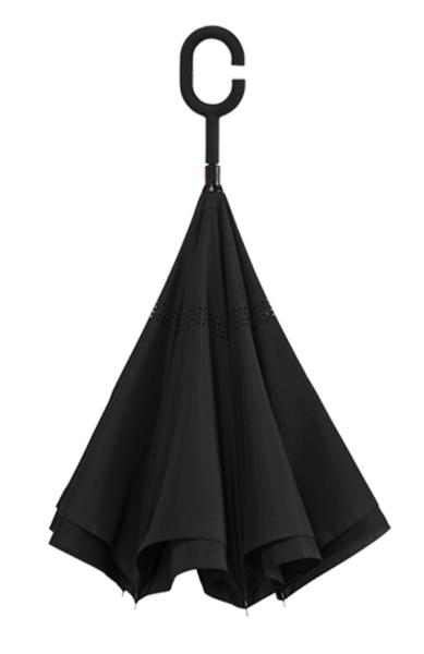 Paraguas reversible con dos telas en color negro, varillas de fibra y mango para poder llevarlo con manos libres.